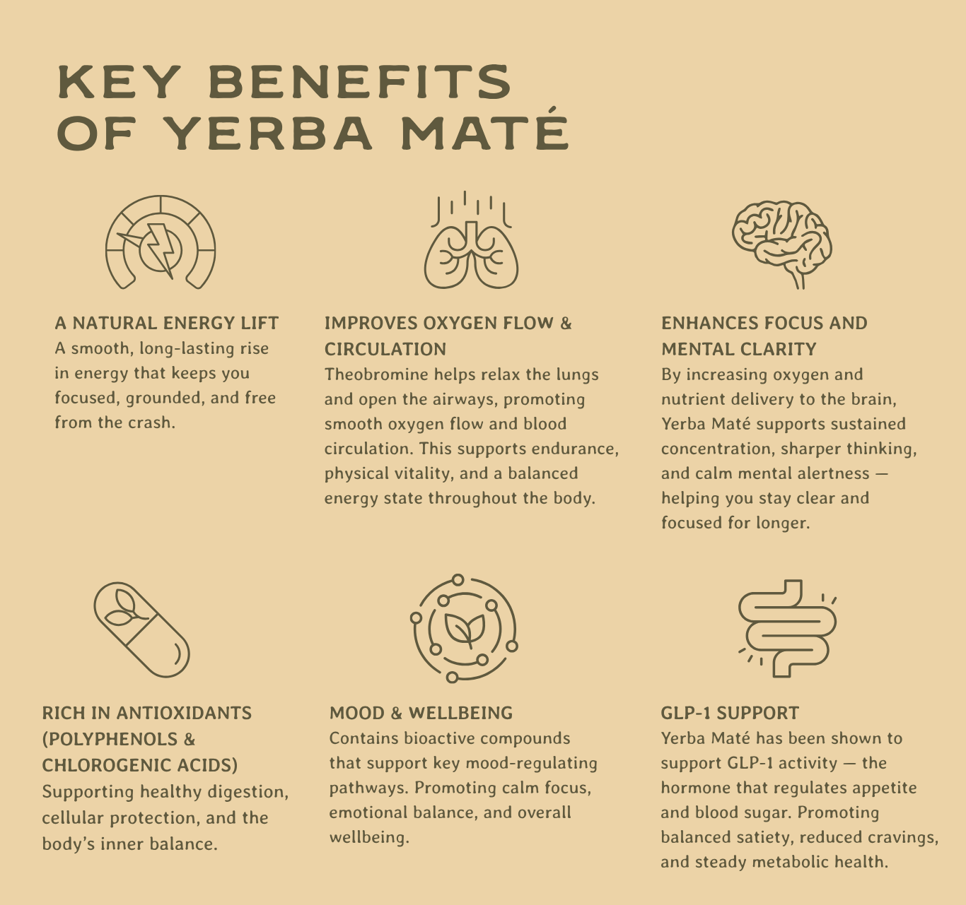 Unlike most stimulants, Yerba Maté delivers a unique balance of natural energy and mental clarity — thanks to its combination of caffeine, theobromine (the feel-good compound also found in cacao), and a wide spectrum of antioxidants and polyphenols.